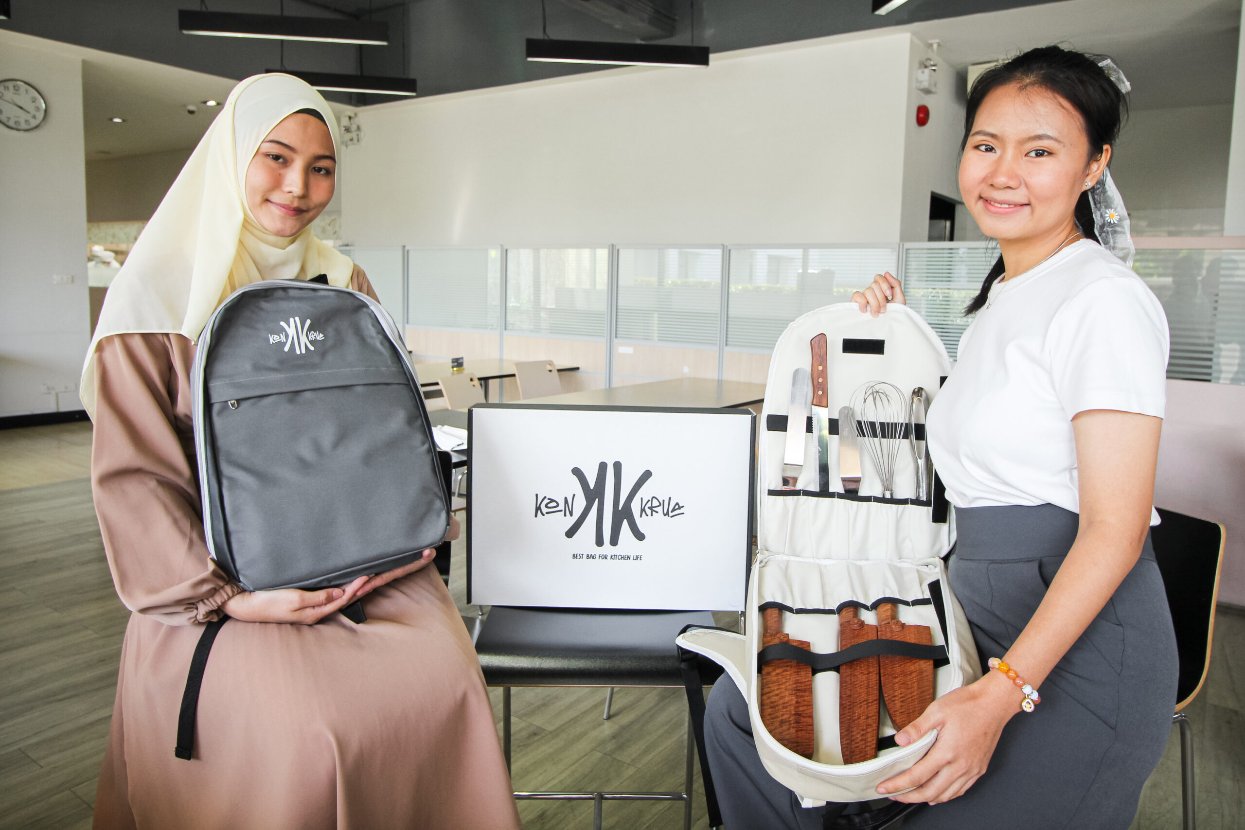 “ส่วนใหญ่ เด็กครัวของที่นี่จะขนอุปกรณ์ไป-กลับระหว่างที่พักกับวิทยาลัยค่ะ เพราะต้องใช้อุปกรณ์ของตัวเองในการเรียนในห้องเรียนและการฝึกซ้อมที่บ้าน ซึ่งอุปกรณ์ครัวก็ไม่ได้มีแค่มีดนะคะ มีทั้งไม้พาย ไม้ตีวิป และอีกสารพัดเลยค่ะ ที่จริงแค่มีดก็มีหลายชนิดแล้ว” เบลล์ – บุษบากร สุวรรณสิทธิ์ และ ไอด้า – นุสรา วันโมรี 2 สาวศิษย์เก่าสาขาวิชาการจัดการครัวและศิลปะการประกอบอาหาร วิทยาลัยดุสิตธานี อธิบายถึงปัญหาของสิ่งที่ต้องพกมาเป็นประจำสมัยเรียน “เด็กครัวมีปัญหาเรื่องการพกอุปกรณ์ไปเรียนค่ะ เพราะจากที่มีข้อมูลตอนนี้ เด็กครัวจะเอาอุปกรณ์ครัวใส่กล่องบ้าง ใส่ถุงบ้าง ซึ่งตอนหยิบมาใช้ก็ไม่สะดวก ต้องคุ้ยหาอุปกรณ์ในนั้น แถมเราไม่ได้ขนมาแค่อุปกรณ์ครัวอย่างเดียวด้วย มีหนังสือเรียนอีก เราก็กลับมาคิดกันว่าทำไมเราต้องพกสัมภาระมาหลาย ๆ ใบ ทั้งที่สามารถรวมกันได้ในใบเดียวแล้วจะสะดวกมากกว่า”