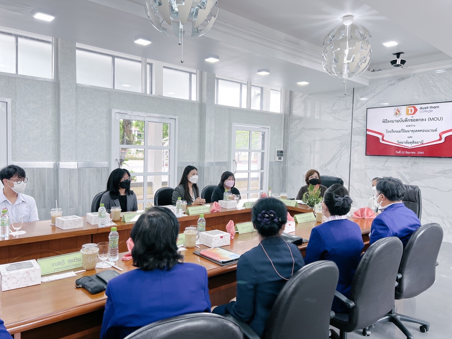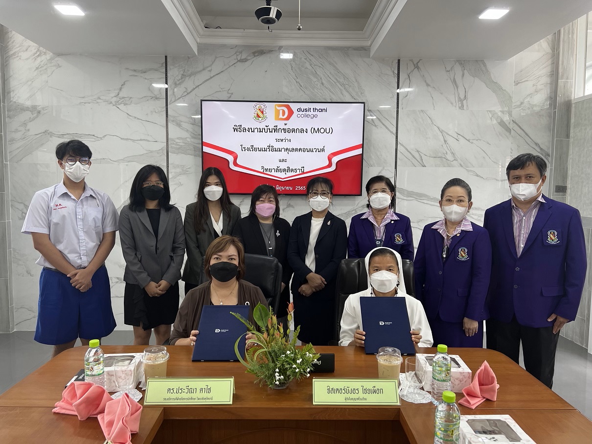 Dusit Thani College, a leading private higher educational institute specialized in hospitality businesses which is led by Dr. Praweena Kasai (the 1st from the front left) – Vice Rector for Student Affairs, together with the College’s management team paid a visit to Mary Immaculate Convent School, a private school under Catholic Education Council of Thailand which is led by Ms. Bang-Orn Chaiyapheuk (the 1st from the front right) – Representative, on the occasion of signing a “Memorandum of Understanding (MOU)”.