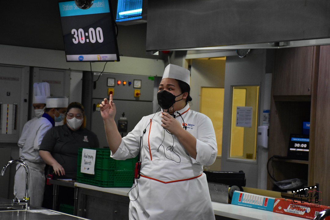นักศึกษาระดับปริญญาตรี สาขาการจัดการครัวและศิลปะการประกอบอาหาร ประกอบด้วย นายวัชรพงศ์ สาลำ นส.เกสรา ชัยกิตติพร นส.ลักษิกา ศาสตร์ภักดี
