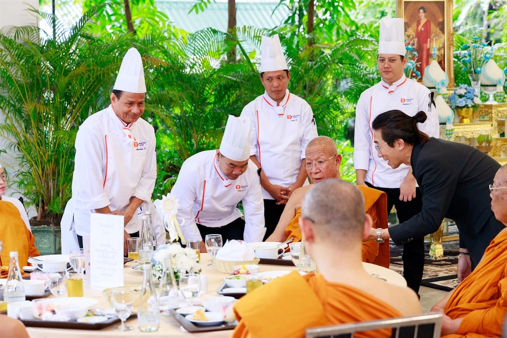 ในโอกาสนี้ คุณหญิงกษมา วรวรรณ ณ อยุธยา นายกสภาวิทยาลัยดุสิตธานี ร่วมด้วย คุณชนินทธ์ โทณวณิก ประธานกรรมการและประธานเจ้าหน้าที่บริหารกลุ่ม บริษัท ดุสิตธานี จำกัด (มหาชน) และอุปนายกสภาวิทยาลัยดุสิตธานี ดร.พิศาล สร้อยธุหร่ำ กรรมการสภาวิทยาลัยผู้ทรงคุณวุฒิวิทยาลัยดุสิตธานี และ ดร.อรรถเวทย์ พฤกษ์สถาพร อธิการบดีวิทยาลัยดุสิตธานี ได้นำคณาจารย์และนักศึกษาสาขาศิลปะการประกอบอาหาร ไปปรุงอาหารทั้งคาวและหวานเพื่อถวายเป็นภัตตาหารเพลแด่พระสงฆ์ที่สวดพระพุทธมนต์ พระสงฆ์ที่มาติกา-สดับปกรณ์ และพระภิกษุสามเณรวัดปทุมวนาราม รวมจำนวน 110 รูป ในขณะที่คณาจารย์และนักศึกษาสาขาการจัดการโรงแรมทำหน้าที่เป็นผู้ให้บริการ โดยมีคณะจากสถาบันเทคโนโลยีจิตรลดาร่วมด้วย