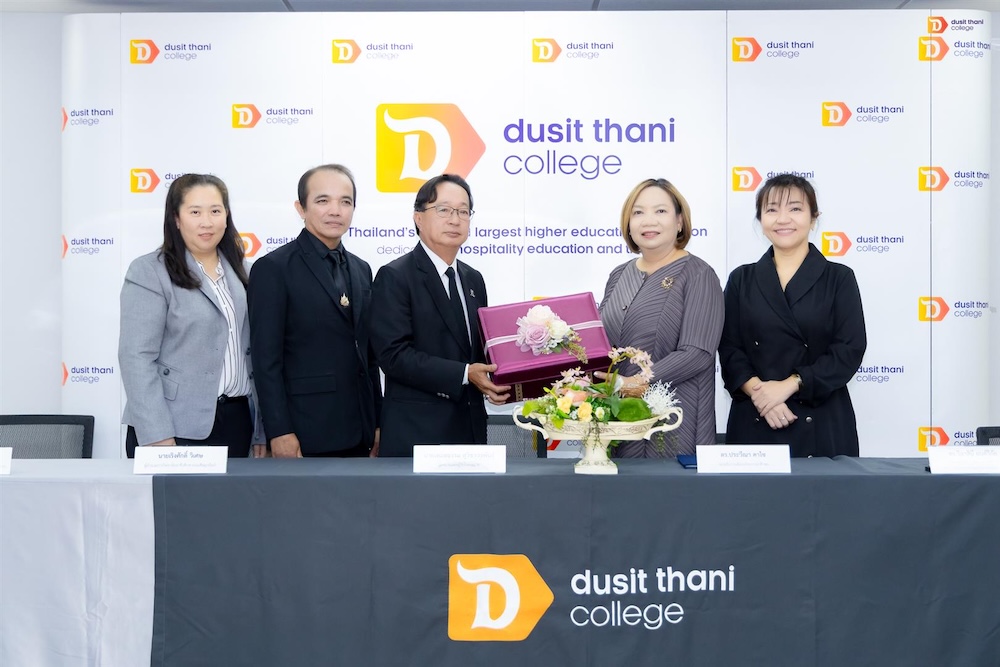 เมื่อวันที่ 9 ธันวาคม 2568 วิทยาลัยดุสิตธานี นำโดย ดร.ประวีณา คาไซ รองอธิการบดีฝ่ายกิจการนักศึกษา ดร.วิลาสินี ยนต์วิกัย รองคณบดีศูนย์บริหารธุรกิจและการศึกษาทั่วไป และรักษาการผู้อำนวยการหลักสูตรบริหารธุรกิจมหาบัณฑิต และคุณรักเกล้า ตั้งกุลพานิชย์ ผู้ช่วยอธิการบดีสำนักรับสมัครนักศึกษา ต้อนรับคณะผู้บริหารและคณาจารย์จาก วิทยาลัยอาชีวศึกษาออมสินอุปถัมภ์