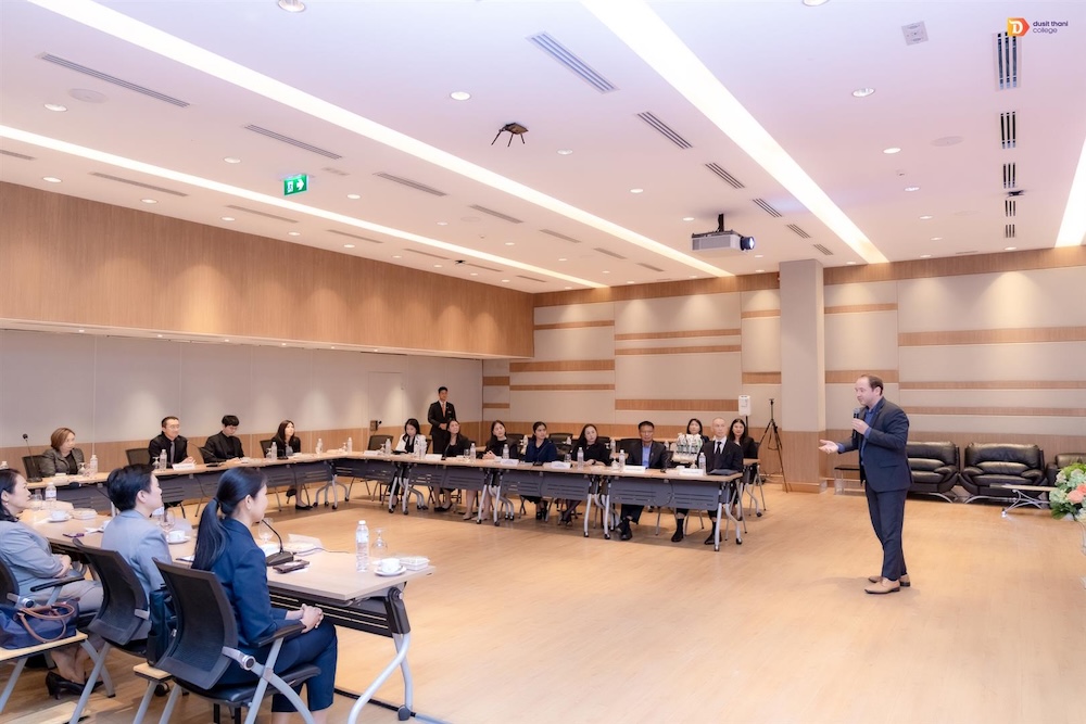 ในโอกาสนี้ ดร.อรรถเวทย์ พฤกษ์สถาพร อธิการบดีวิทยาลัยดุสิตธานี ได้ให้การต้อนรับคณะผู้แทนจากโรงแรมต่างๆ พร้อมทั้งกล่าวว่า “วิทยาลัยดุสิตธานีนับเป็นสถาบันอุดมศึกษาแห่งแรกของประเทศไทยที่ดำเนินการโดยภาคธุรกิจเอกชน ภายใต้การบริหารของเครือโรงแรมดุสิตธานี ก่อตั้งขึ้นโดยท่านผู้หญิงชนัตถ์ ปิยะอุย ด้วยวิสัยทัศน์อันก้าวไกลในช่วงที่อุตสาหกรรมการท่องเที่ยวไทยเริ่มเติบโตอย่างรวดเร็ว ท่านเล็งเห็นว่า ประเทศไทยมีนักท่องเที่ยวเพิ่มขึ้นอย่างต่อเนื่อง แต่ยังขาดบุคลากรที่มีสมรรถนะเพียงพอในการรองรับความต้องการของภาคอุตสาหกรรม ท่านจึงก่อตั้งวิทยาลัยดุสิตธานีขึ้นเพื่อเติมบุคลากรเข้าสู่ตลาดงาน แม้ปัจจุบันจะมีเทคโนโลยี AI แต่สำหรับธุรกิจบริการนั้นไม่ใช่เพียงแค่มือ แต่เราใช้หัวใจในการทำงาน ซึ่งเป็นเรื่องที่ AI ไม่อาจทดแทนได้”