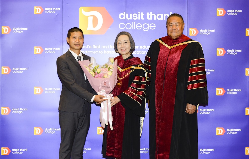 คุณสุเมธชัย อินทกรณ์ ศิษย์เก่ารุ่นที่ 8 สาขาการจัดการครัวและภัตตาคาร ปัจจุบันเป็นกรรมการผู้จัดการ ห้างหุ้นส่วนจำกัด โอคุริ เฮ้าส์ โดยเมื่อปีก่อน เขาเพิ่งได้รับรางวัลสุดยอดซีอีโอรุ่นเอสเอ็มอี สาขาธุรกิจค้าปลีกและค้าส่ง จากงาน CEO Econmass Awards 2025 ซึ่งจัดโดยสมาคมผู้สื่อข่าวเศรษฐกิจ ร่วมกับ คณะกรรมการร่วมภาคเอกชน 3 สถาบัน (กกร.) มหาวิทยาลัยหอการค้าไทย และสานักงานคณะกรรมการนโยบายรัฐวิสาหกิจ (สคร.) ส่วนในปีก่อนหน้านั้นก็ได้รับรางวัล Success Case โครงการยกระดับและสร้างมูลค่าเพิ่มผลิตภัณฑ์เกษตรแปรรูป จากกรมส่งเสริมอุตสาหกรรม “วิทยาลัยดุสิตธานีไม่เพียงทำให้ผมมีพื้นฐานและทักษะด้านธุรกิจบริการที่แน่น แต่ยังสอนให้ผมมีใจบริการและรู้จักเห็นอกเห็นใจผู้อื่น ไม่ว่าจะต่อลูกค้า ผู้ร่วมงาน หรือหัวหน้างาน”