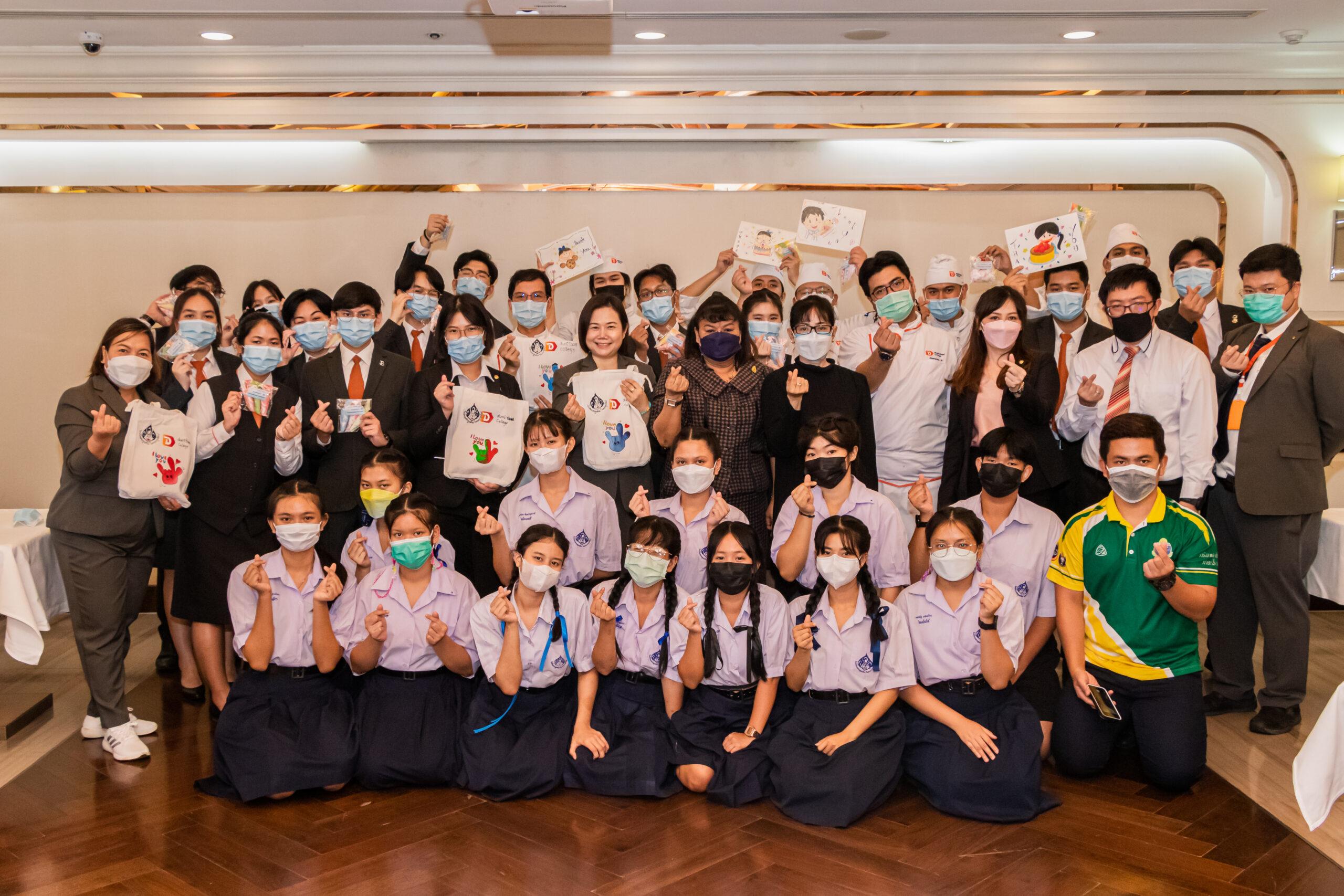 วิทยาลัยดุสิตธานี สถาบันอุดมศึกษาเอกชนชั้นนำทางด้านธุรกิจบริการ นำโดย ดร.อรรถเวทย์ พฤกษ์สภาพร (แถวบนที่ 6 จากซ้าย) รองอธิการบดีฝ่ายวิชาการและกิจการคณาจารย์ และ ดร.ประวีณา คาไซ (แถวบนที่ 9 จากขวา) รองอธิการบดีฝ่ายกิจการนักศึกษา พร้อมด้วยคณะผู้บริหารและอาจารย์ให้การต้อนรับ คณะครูและนักเรียนจากโรงเรียนเศรษฐเสถียร ในพระราชูปถัมภ์ โรงเรียนสอนคนหูหนวกแห่งแรกของประเทศไทย นำโดย ครูจินดา อุ่นสอน และครูฉวีวรรณ แพงหอม เพื่อร่วมทำกิจกรรม “เรียนรู้มารยาทการรับประทานอาหารแบบสากล (Table Manners)” โดย อ.วัชรา กิ่งโก้ กรรมการบริหารหลักสูตรการจัดการโรงแรม ณ ห้องอาหารมะฮอกกานี วิทยาลัยดุสิตธานี เมื่อวันก่อน